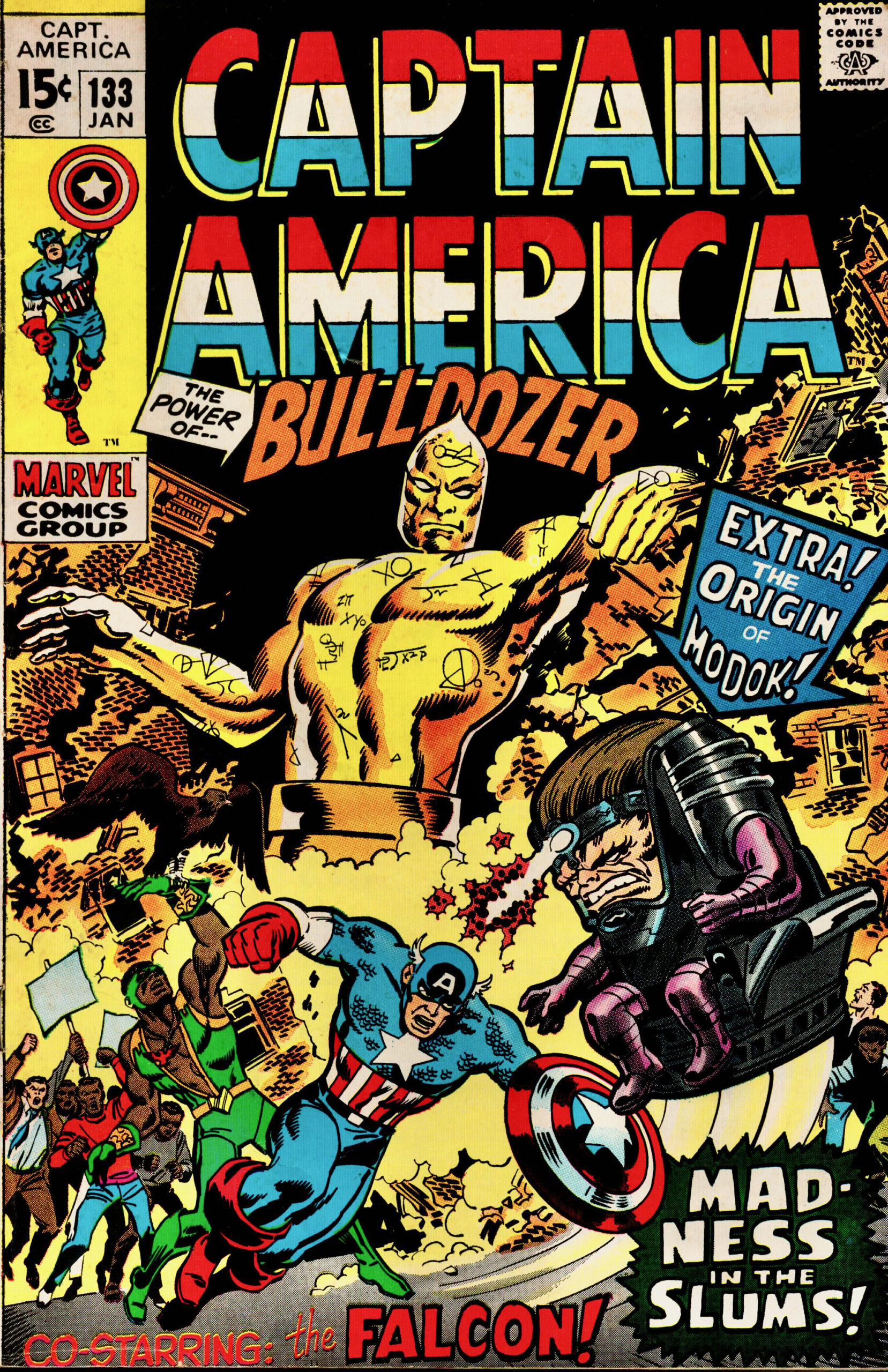 Falcon teams up with Captain America against MODOK’s next creation, the Bulldozer.